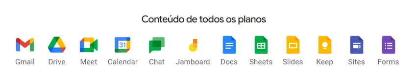 Atualmente, as empresas podem escolher entre quatro opções de plano do Google Workspace. Todos os planos incluem os seguintes aplicativos:
